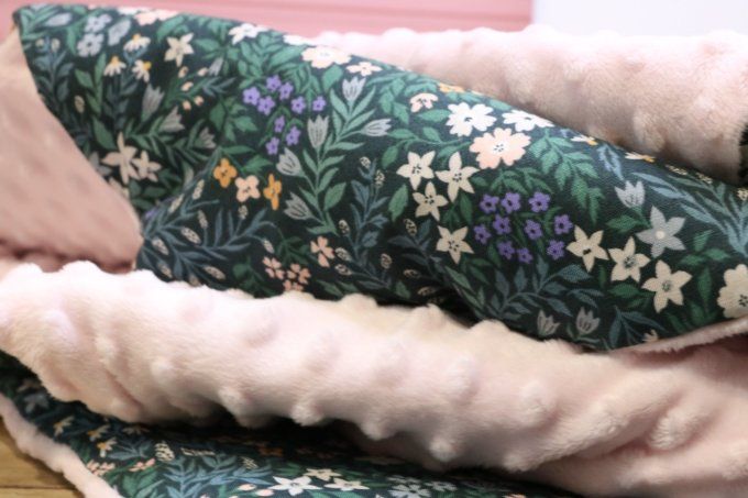 Composition : Coton à motifs fleurs, minky rose pâle. Intérieur doublé de ouate.