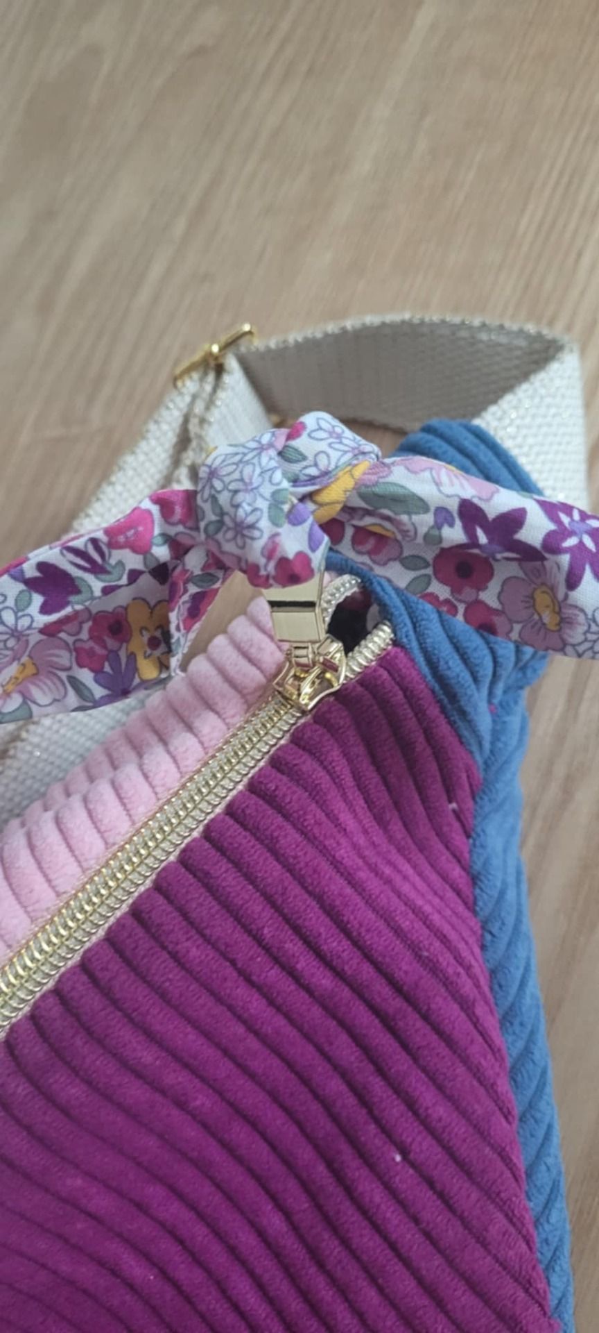 Le petit truc en + : Le curseur doré et son joli noeud à motif (tissu identique à la doublure)