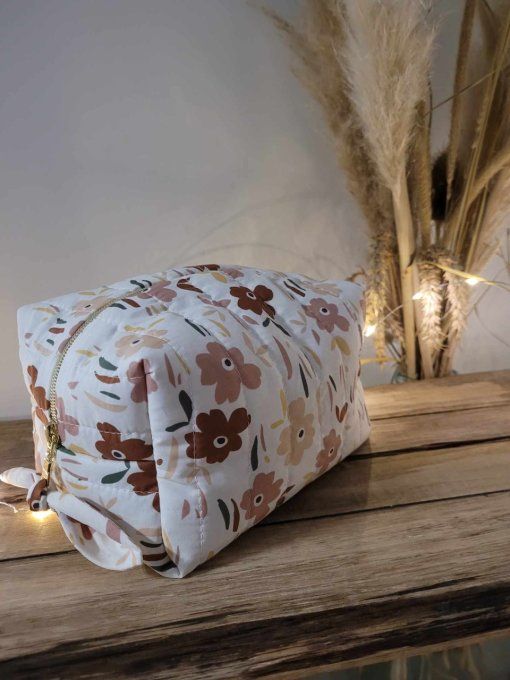 Composition : Extérieur en coton matelassé à fleurs. Intérieur en coton uni beige pailleté. Fermeture et curseur doré.